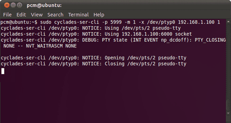 sudo cyclades-ser-cli -p 5999 -m 1 -x /dev/ptyp0